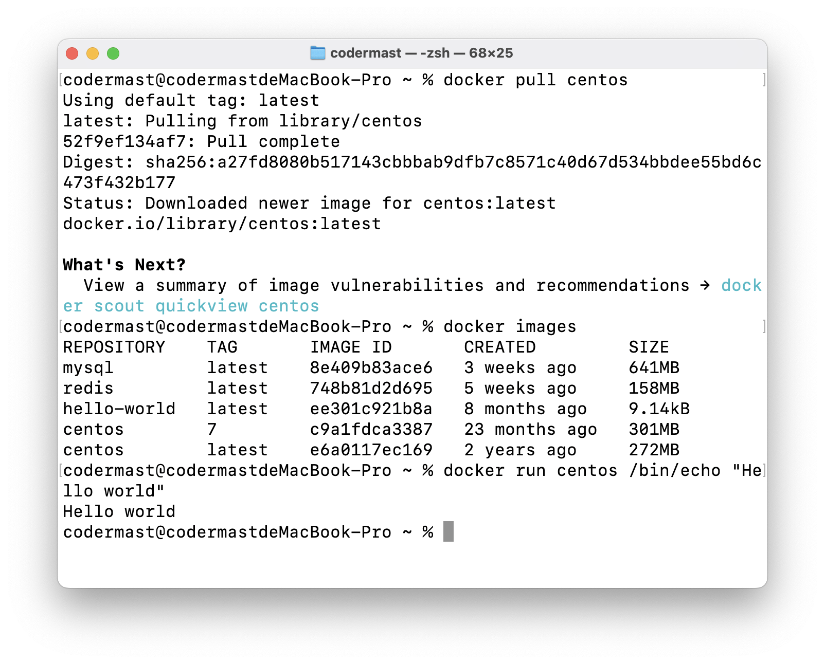 docker run centos /bin/echo "Hello world"